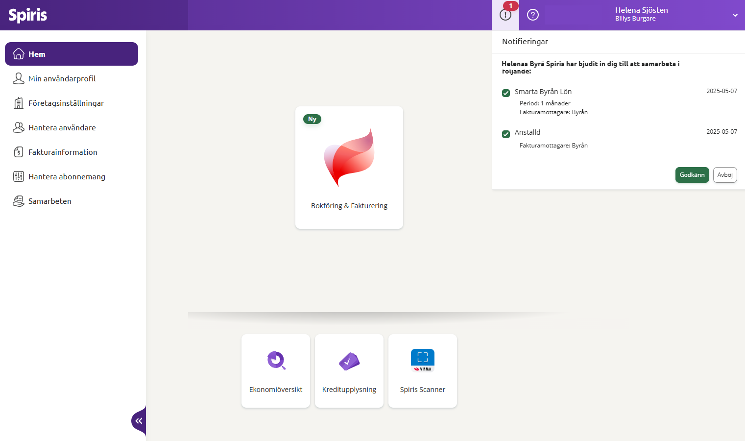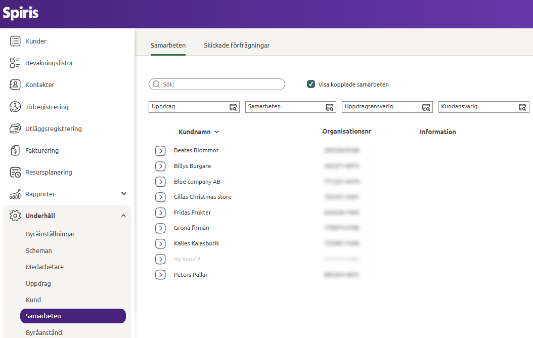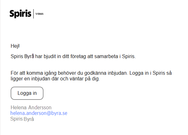 The customer receives an invitation mail and logs in to Spiris and approves the collaboration. Under Settings - Collaborations and the Sent requests tab, you can keep track of who you sent a request to and whether they accepted your invitation.