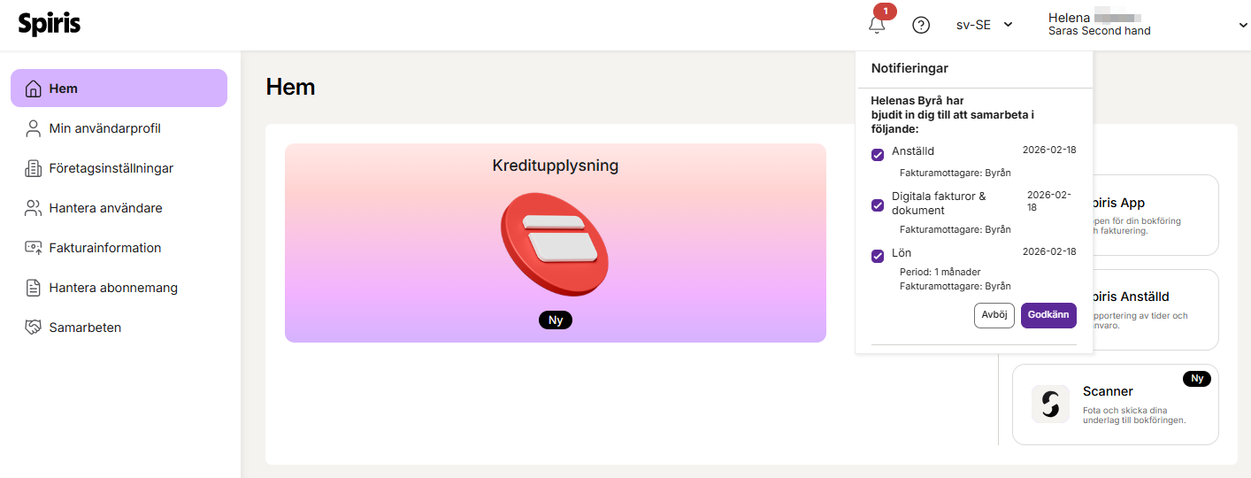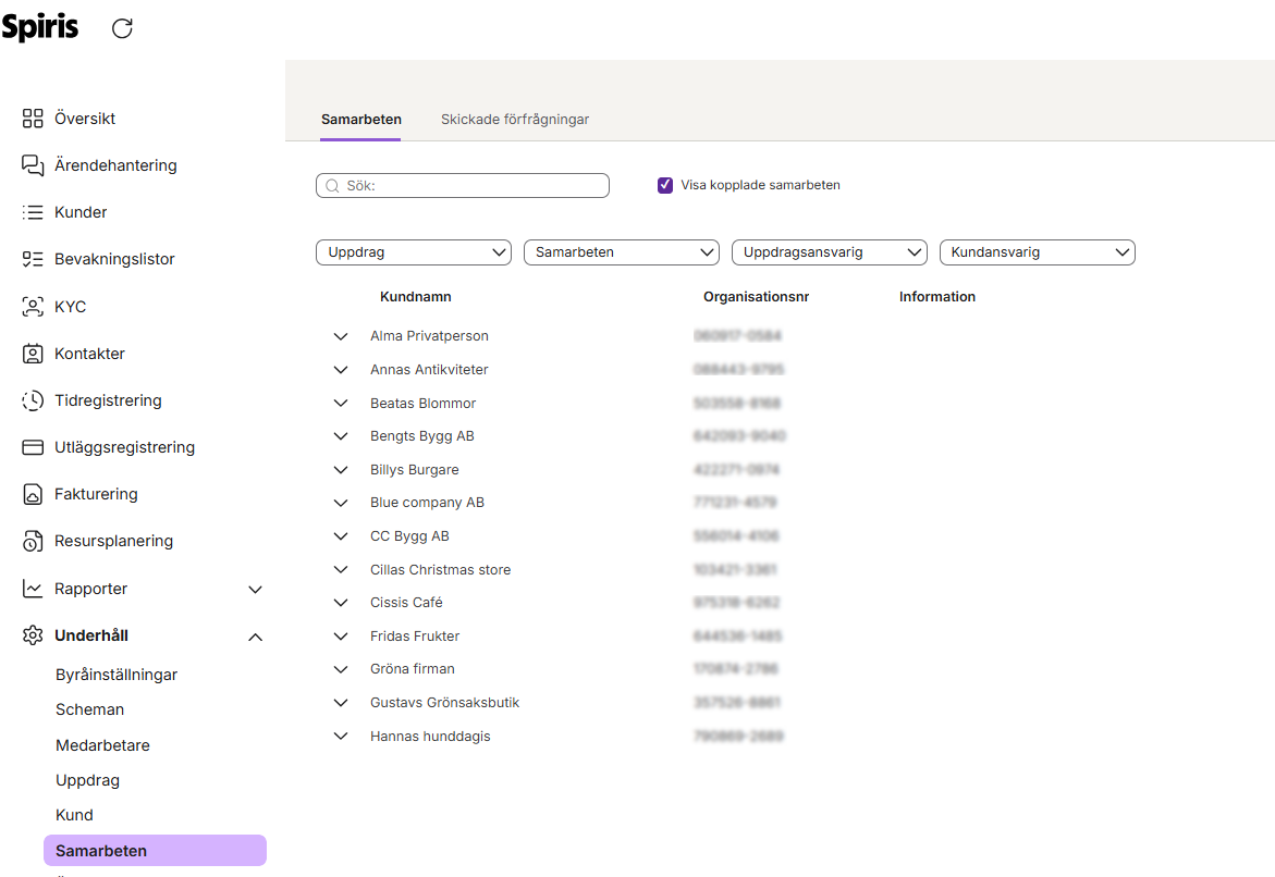 Kunden får ett mejl med en inbjudan och loggar in på Spiris för att godkänna samarbetet. Under Underhåll - Samarbeten och fliken Skickade förfrågningar kan du hålla koll på vem du skickat en förfrågan till och om de godkänt din inbjudan.
