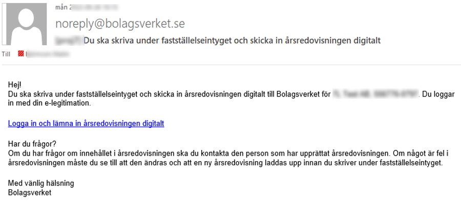 Bolagsverket will automatically send a mail to the e-mail addresses you have entered on the Submission page. The mail looks slightly different if the annual report includes an auditor's report.