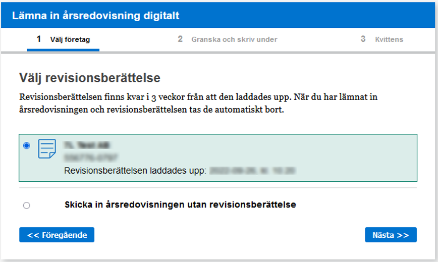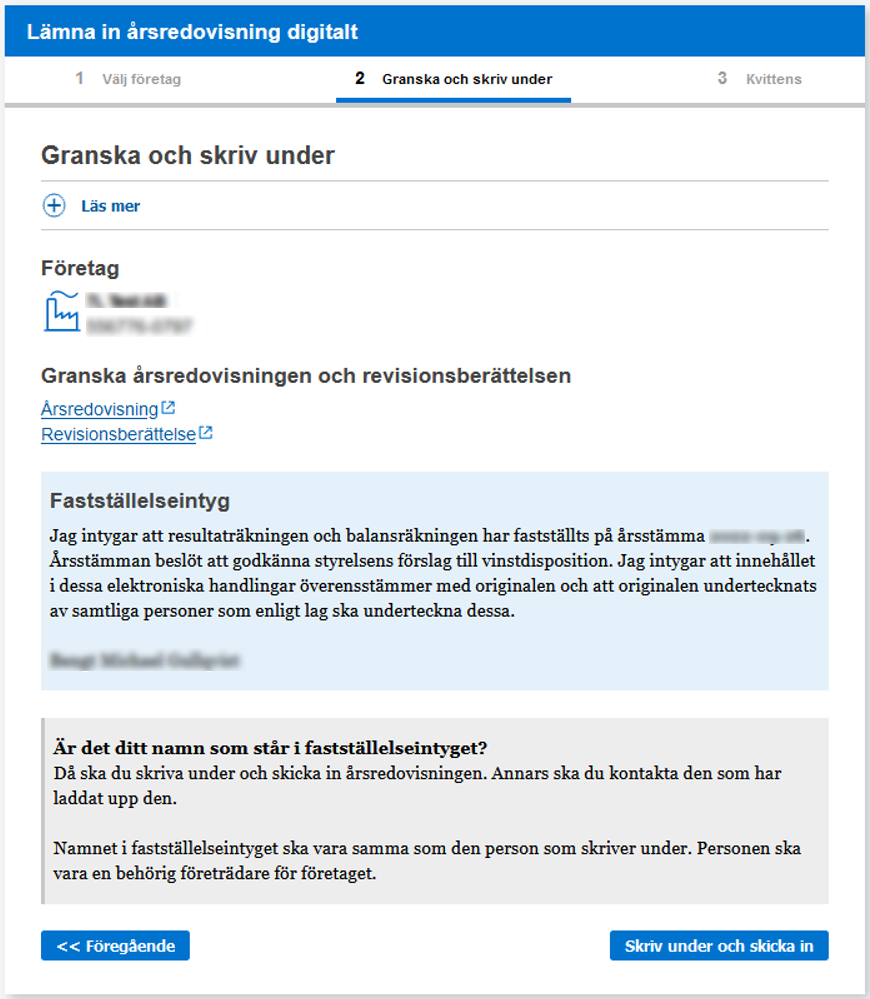 Performs an automatic check against Bolagsverket. This step can be performed to ensure that the company information entered in your annual report corresponds to the information at Bolagsverket. The annual report will not be submitted by doing this.