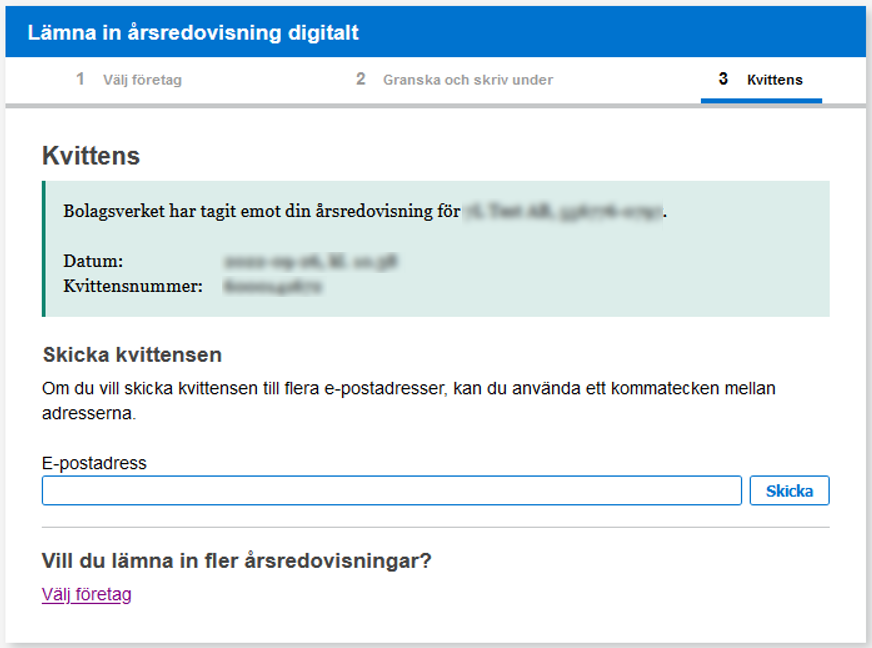 When the financial statements approval is signed and the documents are received at Bolagsverket, a receipt is displayed. Here, it's also possible to send a copy of the receipt via e-mail