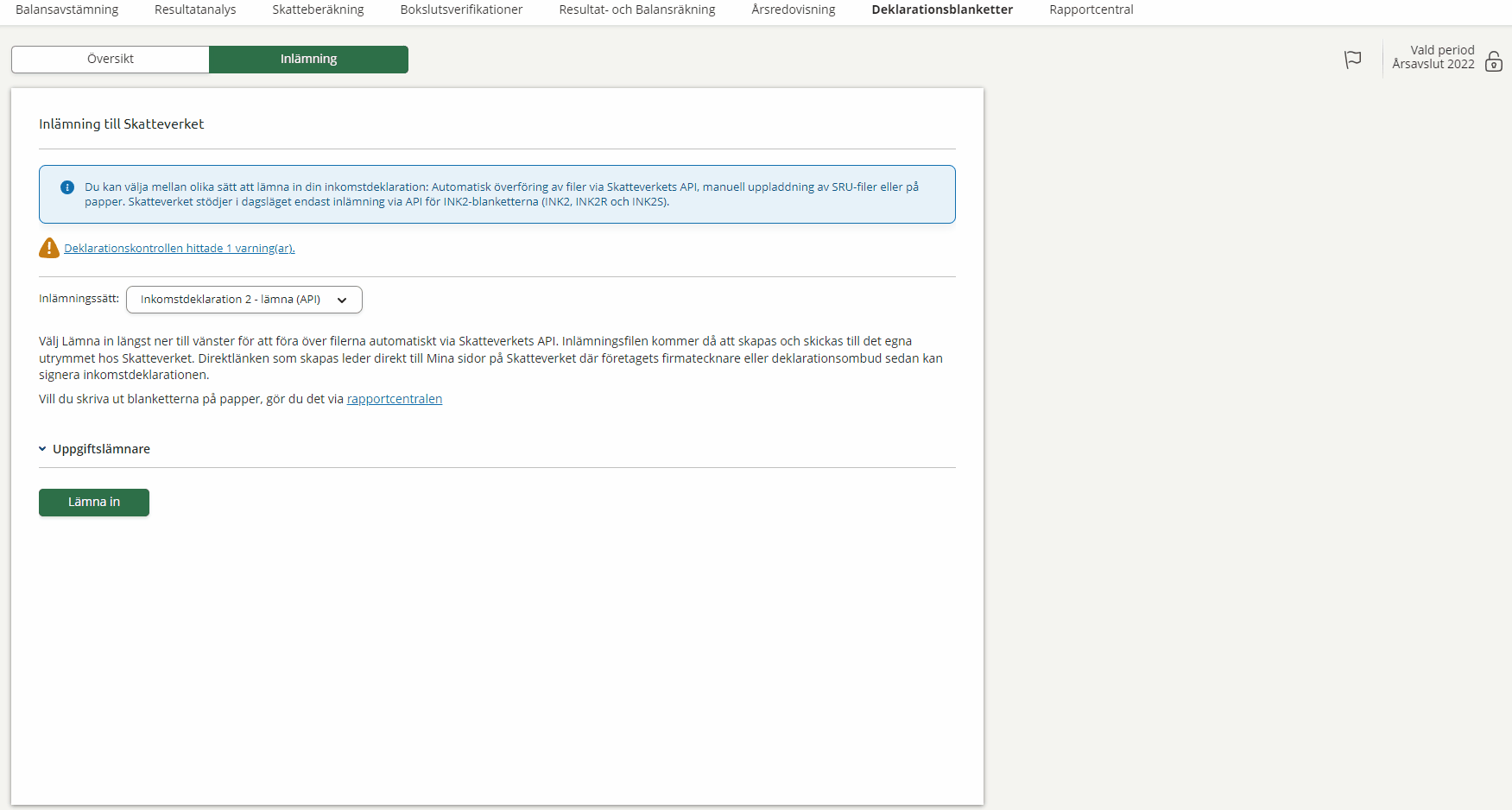 When it is time to close the financial year and submit your company's information, you can do so easily in the submission view. Here you can get help checking that everything has been filled in correctly before you submit your tax return digitally or print it out for manual processing.