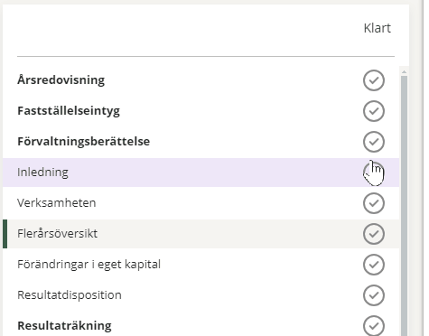 When a document is completed, you mark it as complete by clicking on the status symbol in the column Done in the view on the left. The status change will be indicated with your name and a time stamp and no further changes can be made