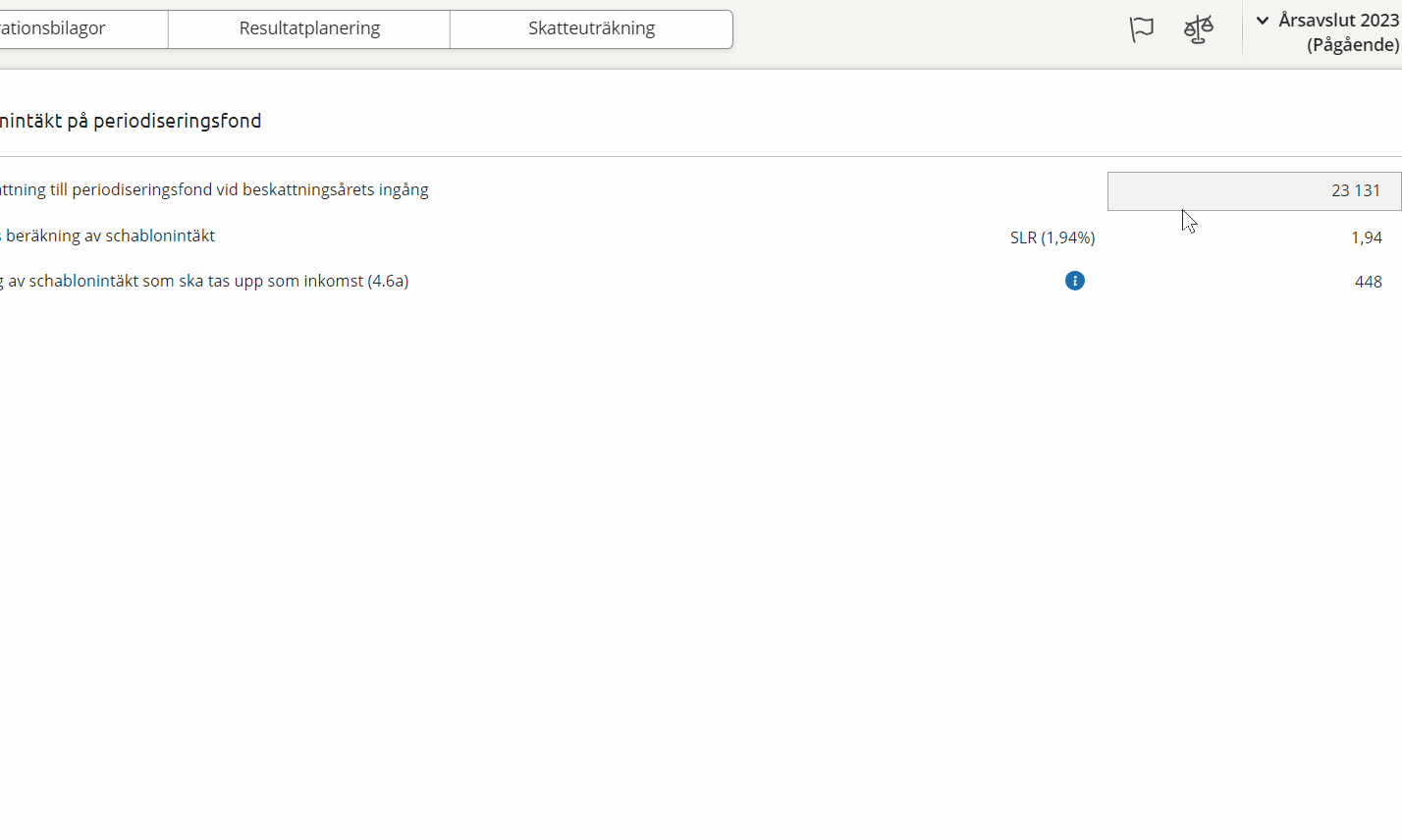 Under you do adjustments to your result. Under Result, you see what alternative has been selected under Profit/loss planning, the current result and the income tax.