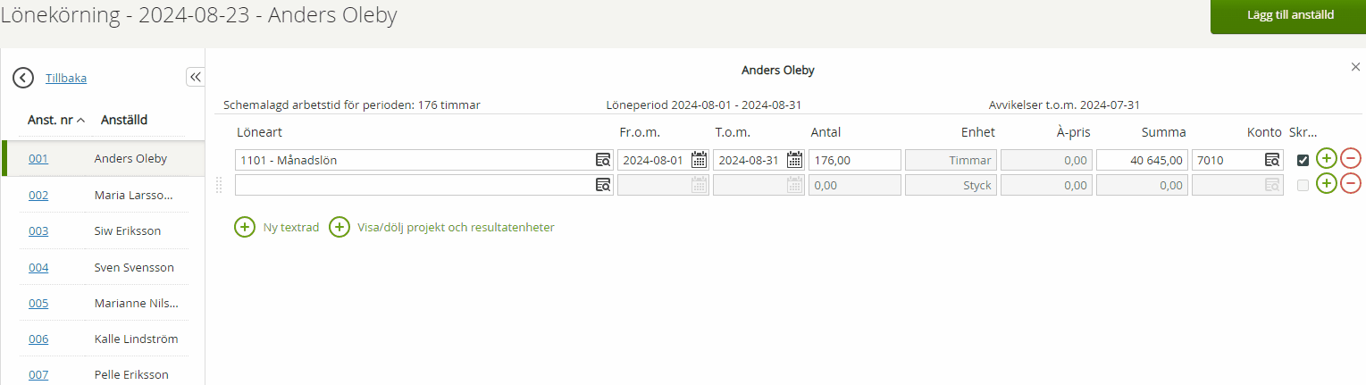 När du är i kalendern eller på en anställds lönebesked tar du dig enkelt till anställningsregistret genom att klicka på anställningsnumret i listan till vänster.