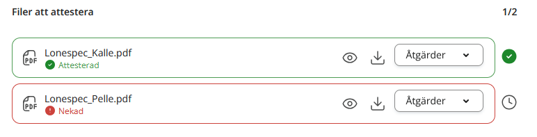 Om du attesterar dokumentet visas det med en grön ram runt och en markering för Attesterat. Avvisar du, visas detta med en röd ram och en markering för Avvisat.