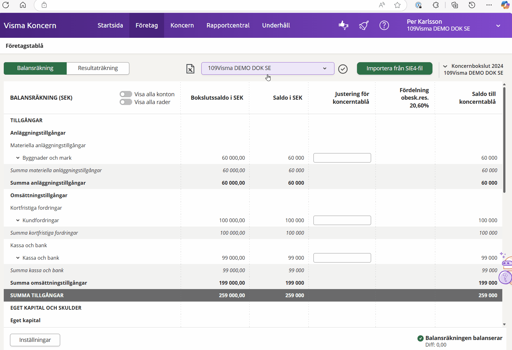 - Redovisad utgående balans för koncernen hämtas automatiskt från koncerntablån.