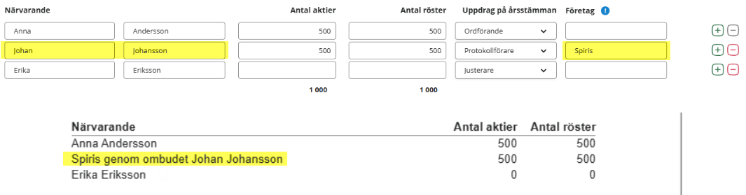 Nu kan du enkelt visa när ett företag deltar på årsstämman via ombud. Fyll bara i företagsnamnet i det nya fältet, så visas både företaget och ombudet automatiskt i närvarolistan, till exempel "Spiris genom ombudet Johan Johansson".