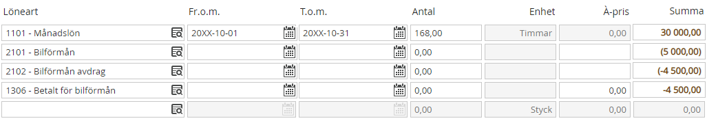 - Ange det belopp som ska dras för bilförmånen från den anställdes nettolön.