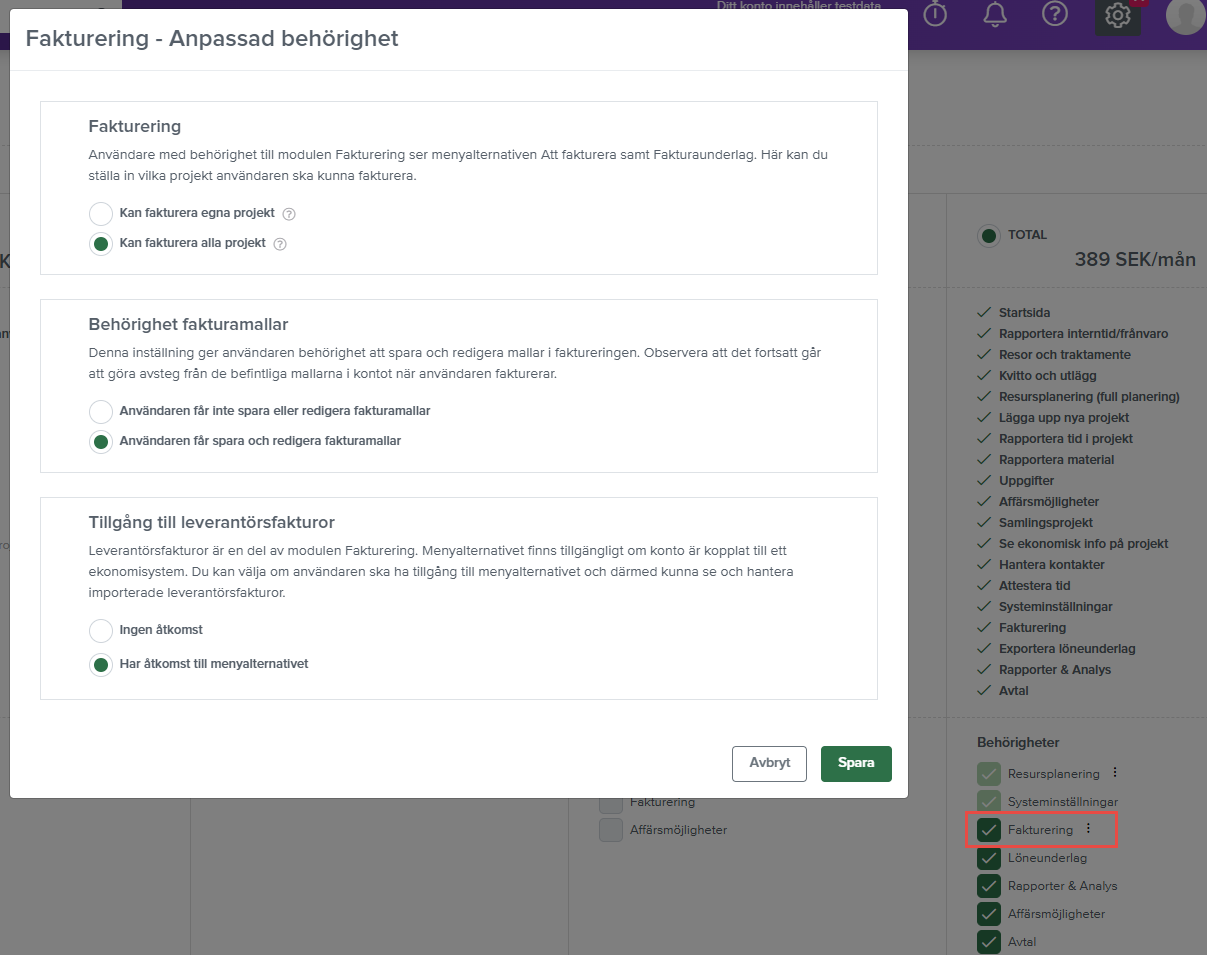 Vilken behörighet användaren ska ha anger du genom att klicka på de tre prickarna till höger om Fakturering, längst ner på sidan under Inställningar - Generellt - Licenser och användare. Vad du kan välja mellan beror på vilken licens du har.