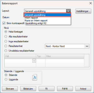 När du väljer vilken layout du vill ha för dina balans- och resultatrapporter så sparas dessa numera per företag. Det innebär att du kan ha olika utseende för dina rapporter om du jobbar med flera olika företag i Visma Administration 1000. När du väljer rapportlayout kan du endast välja de som är aktuella för din bolags- och kontoplanstyp.
