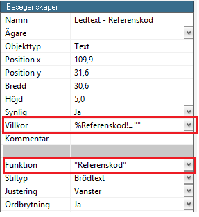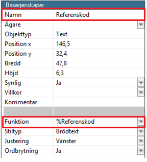 - Skapa en ny textruta enligt punkt 4 och placera den efter rutan som innehåller ledtexten. Lägg sedan in följande uppgifter i rutan Basegenskaper: