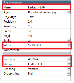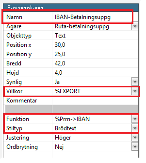 - För att lägga till IBAN-numret som hämtas från skapar du en textruta på samma sätt som i punkt 4, men du placerar den där du vill ha IBAN-numret. Lägg in följande information i respektive fält under Basegenskaper: