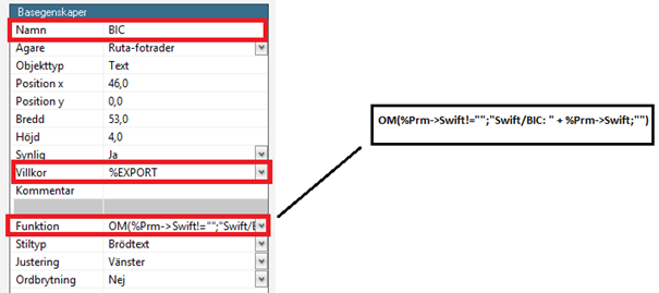 - Vill du även lägga till Swift/BIC så skapar du en textruta enligt punkt 4. Markera den plats på mallen där du vill placera informationen om BIC och lägg in följande information under Basegenskaper: