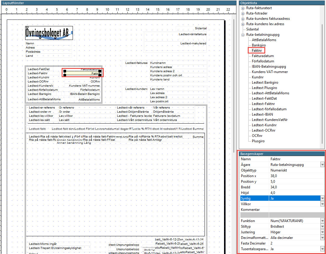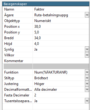- Notera först vad du har för uppgifter för det nuvarande objektet Faktnr. Det du ska notera är värdena för Ägare, Position x, Position y, Bredd, Höjd, Stiltyp och Justering. Dessa hittar du till höger under Basegenskaper.