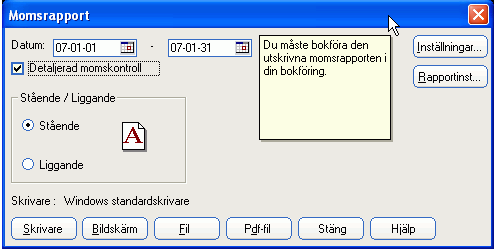 Det är väldigt viktigt att du bokför den med verifikationsdatum som är den siste i perioden som du skrev ut momsrapporten för. Detta för att ingående saldo på dina momskonton ska vara 0 när du skriver ut momsrapporten nästa gång.