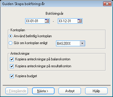 Här kan du även välja att kopiera anteckningar på balans- och resultatkonton samt kopiera föregående års budget.