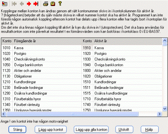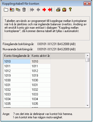 Om du har bytt kontoplan från t ex BAS 96 till BAS 2009, kan du gå in under Arbeta med - Kontoplan för attRedigera koppling.- Här ser du vilka kopplingar som finns mellan de olika bokföringsåren och mellan de kontoplaner du har. De konton som saknar koppling är märkta med ett frågetecken (?) och de konton som inte ska ha en koppling är märkta med ett utropstecken (!).