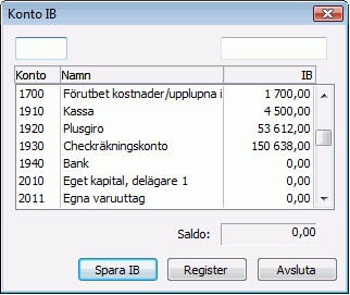 - Efter att du lagt in alla balanserna och Saldo: är noll, klicka på Spara IB.
