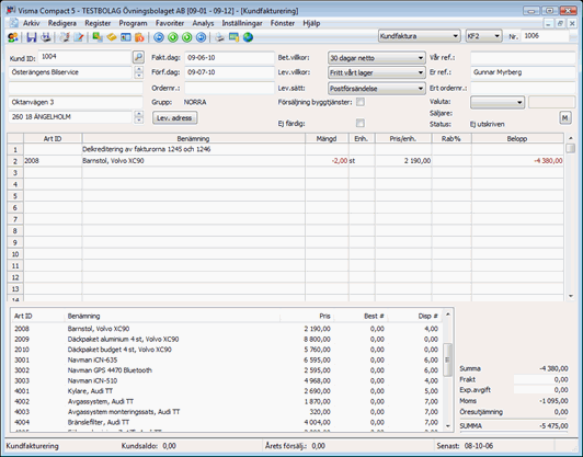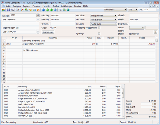 - En kreditfaktura är skapad och visas i fönstret Kundfakturering. Lägg märke till referensen på fakturarad 1. Kreditfakturan får nästa lediga fakturanummer i den fakturaserie du valt.
