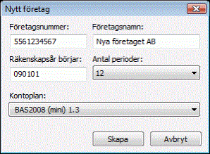 Här fyller du i företagsnummer, företagsnamn och startdatum samt väljer antal perioder som räkenskapsåret ska bestå av och vilken kontoplan du ska använda och utgå ifrån.