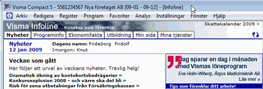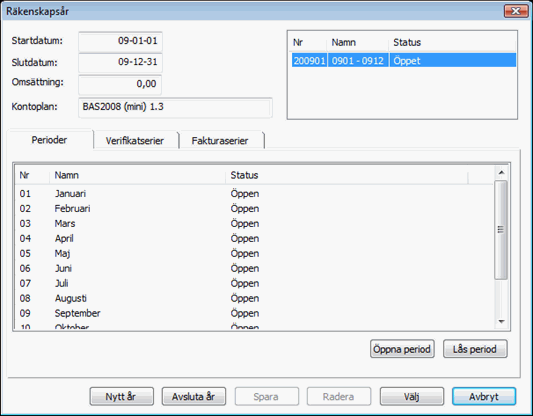Ett räkenskapsår består av ett antal perioder, oftast 12 månader. I Visma Compact är en period alltid lika med en kalendermånad. För att du ska kunna registrera uppgifter i ett räkenskapsår måste det året vara skapat/finnas. I programmet kan du ha tio räkenskapsår.