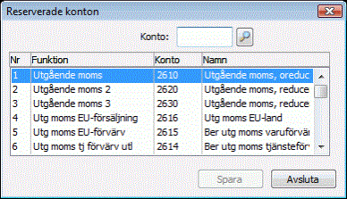 I listan visas alla konton som är reserverade. Det finns 46 funktioner i programmet som använder sig av så kallade reserverade konton.