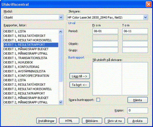 Obs! Rapporterna för objekttyp 1 och 2 är likadana förutom att urvalet görs på respektive objekttyp.Följande objektrapporter finns i programmet:
