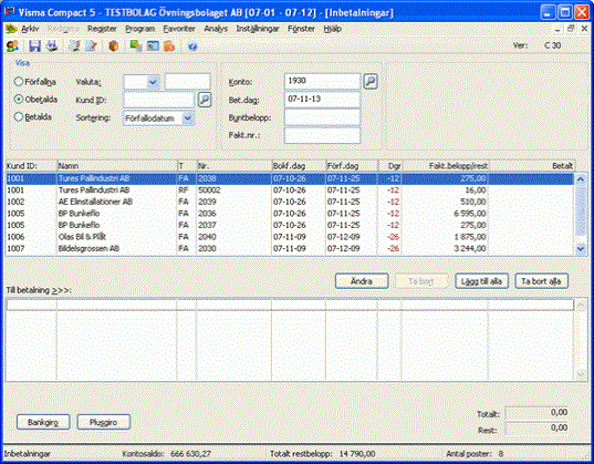 - Leta upp den faktura som du har fått inbetalningen för. I vårt exempel kan du markera en av de fakturor som finns i Övningsbolaget.