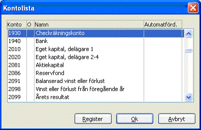- Dubbelklicka på ett nytt konto i listan. Tips! Vill du att det alltid ska föreslås ett annat konto välj Register - Reserverade konton. Bläddra ner till rad 29, Inbetalningskonto och dubbelklicka på den. Ändra 1930 till önskat konto. Spara, stäng och öppna fönstret Inbetalningar igen.