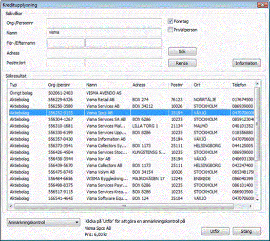 - Accepterar du kostnaden klickar du på Utför. Vill du inte göra anmärkningskontrollen klickar du på Stäng eller gör en ny sökning och då debiteras du inte.