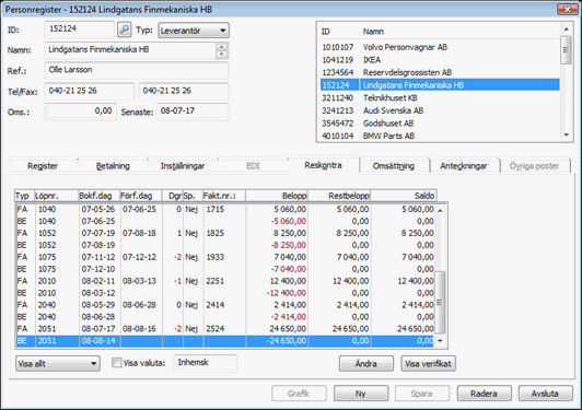 - Programmet kommer nu att visa reskontrainformationen för leverantören. Här ser du alla fakturor från och betalningar till denna leverantör.