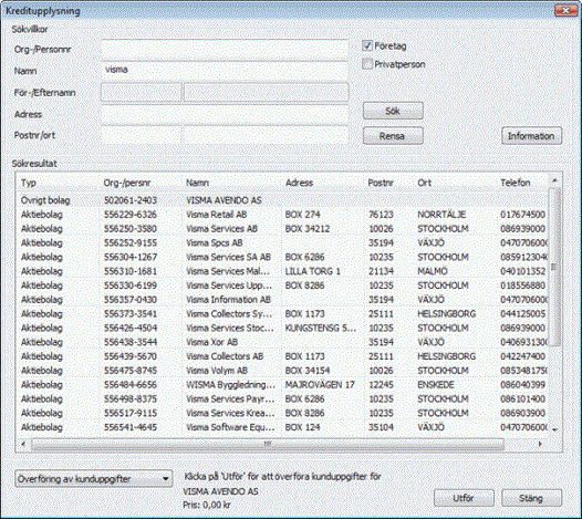 - Du får information om debitering av tjänsten. Accepterar du kostnaden klickar du på Utför. Vill du inte överföra kunduppgifter klickar du på Stäng eller gör en ny sökning och då förs inte uppgifterna över och du debiteras inte.