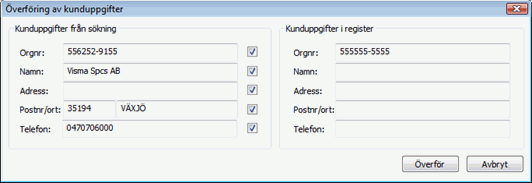 - När du har gjort dina val klickar du på Överför och uppgifterna läggs in på vald kund i Visma Compact. Om du klickar på Avbryt görs ingen överföring av kunduppgifterna.