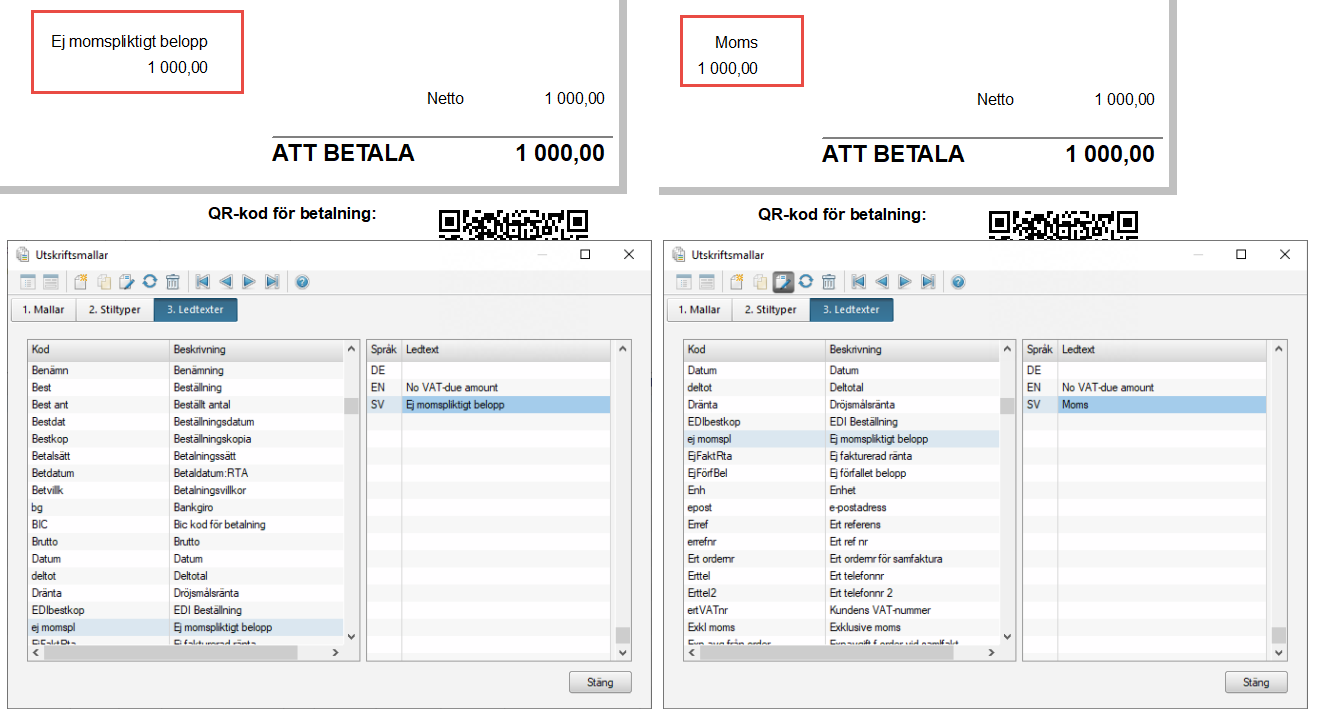 Vill du ändra ledtexten för Ej momspliktigt belopp längst ner på fakturan gör du det under Arkiv - Mallar/Rapportgenerator - Utskriftsmallar, fliken Ledtexter. Markera raden Ej momspl i den vänstra tabellen och ändra till den benämning du vill ha i den högra tabellen, t ex Moms. Tänk på att den här ändringen slår igenom på alla fakturor du skickar efter att ändringen är gjord. Vill du att ledtexten ska gälla en viss faktura gör du ändringen och sedan ändrar du tillbaka igen när fakturan är skickad.