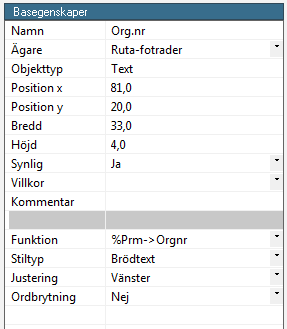 - Vad som avgör var organisationsnumret ska skrivas ut är X och Y värdet. Dessa hittar du under Basegenskaper. Om det ska flyttas mer till höger så ökar du X och om det ska flyttas längre upp på pappret så minskar du Y. Du kan också ändra bredden och höjden här om det skulle behövas.