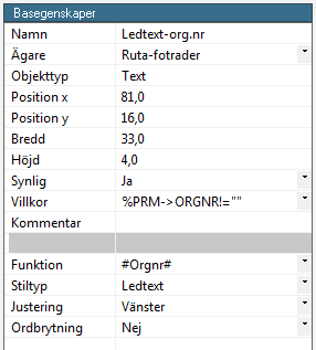 - För att flytta texten Organisationsnummer får du leta upp objektet som heter Ledtext-Org.nr och ändra X- och Y-värdet även på detta objekt. Alla förklarande texter på utskriften heter Ledtext och sedan vad det är för något.
