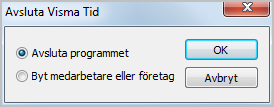 Här väljer du om du vill avsluta programmet eller om du vill byta medarbetare eller företag, d v s logga ut och sedan få möjlighet att göra en ny inloggning.
