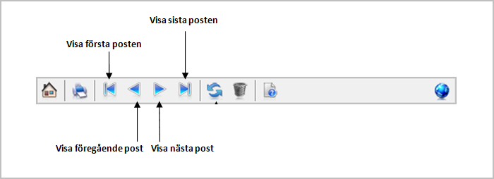 I både listläge och kortläge kan du använda knapparna i knappraden för att bläddra mellan posterna i det aktiva registret. Bläddringsordningen är normalt i bokstavsordning på posternas kod. Vid bläddring i listläget påverkas det av den ordning som är vald med hjälp av att klicka på kolumnrubrikerna.
