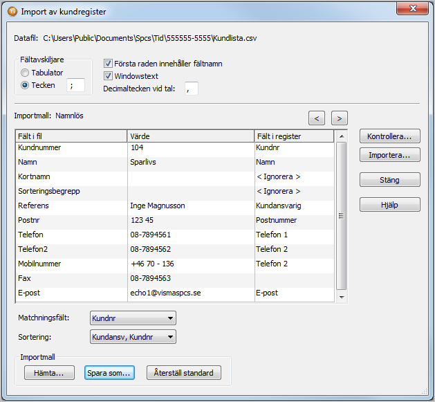 Klicka på den här när alla inställningar är klara, för att importera filen. En kontroll av importfilen sker även nu, innan importen startar. |