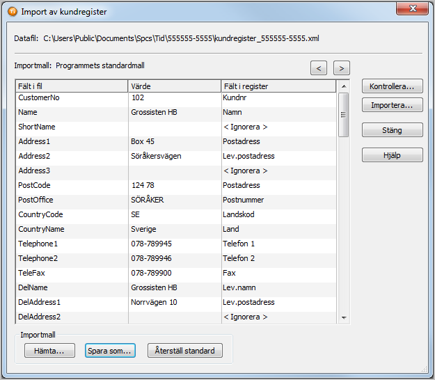 Se till att den senaste versionen av kundregistret är exporterad till en fil och att den är placerad i importmappen för Visma Tid (normalt C:\Users\Public\Documents\SPCS\Tid\xxxxxx-xxxx). Den sista mappen i sökvägen är företagets organisationsnummer.