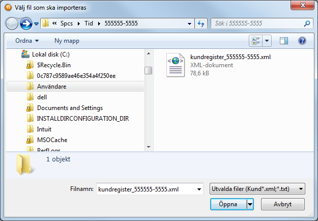 - Markera den fil som innehåller det kundregister du vill importera. Vid behov kan du bläddra dig fram till en annan sökväg. Om det är en textfil du ska importera måste tillägget vara txt för att den ska visas i listan.