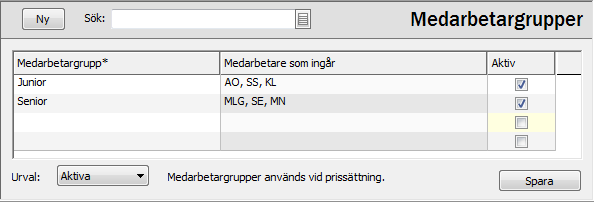 Medarbetargrupper kan användas vid prissättning. I standardprislistorna kan du välja olika prissättningsmetoder, t ex per medarbetargrupp.
