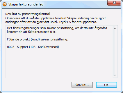 Om du väljer att ignorera varningen kommer de registreringar som programmet inte hittar ett pris till att faktureras med 0 kr.