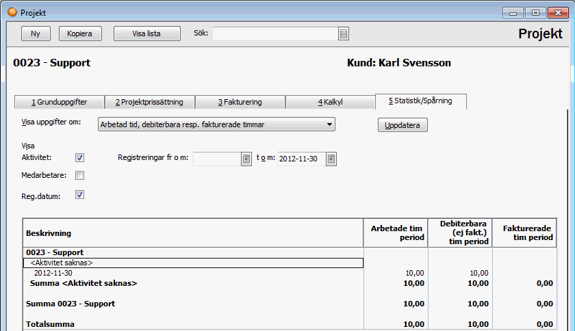 Om du har en prislista som är prissatt per aktivitet ska du kontrollera att det finns en aktivitet angiven på alla tidsregistreringar. Detta gör du på fliken Statistik/Spårning på det aktuella projektet. För att få meddelande när aktivitet saknas markerar du rutan Aktivitet och Reg.datum under Visa.