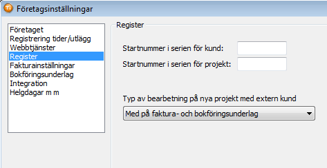 Här anger du ett startnummer för kund- och projektregistret som programmet sedan fortsätter att numrera efter. Nästa post som läggs upp i kund- respektive projektregistret får nästa nummer i serien. Du kan använda både siffror och bokstäver i numret. Om det nummer du lägger in avslutas med en bokstav, lägger programmet automatiskt till 1 i numret för nästa post. Exempel:Om du anger 007 får nästa post i registret nummer 008. Om du anger A03 blir nästa post i registret nummer A04. Om du anger 103A blir nästa post i registret 103A1. |