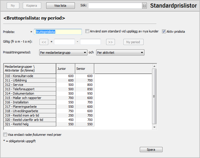 - Ange ett slutdatum vid Giltig (fr o m - t o m), eller lämna fältet tomt om prislistan ska gälla tills vidare.