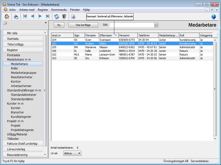 I de register som har både listläge och kortläge kan du sortera innehållet, d v s påverka i vilken ordning de olika posterna visas. Det gör du genom att klicka på kolumnrubrikerna. Gör så här: